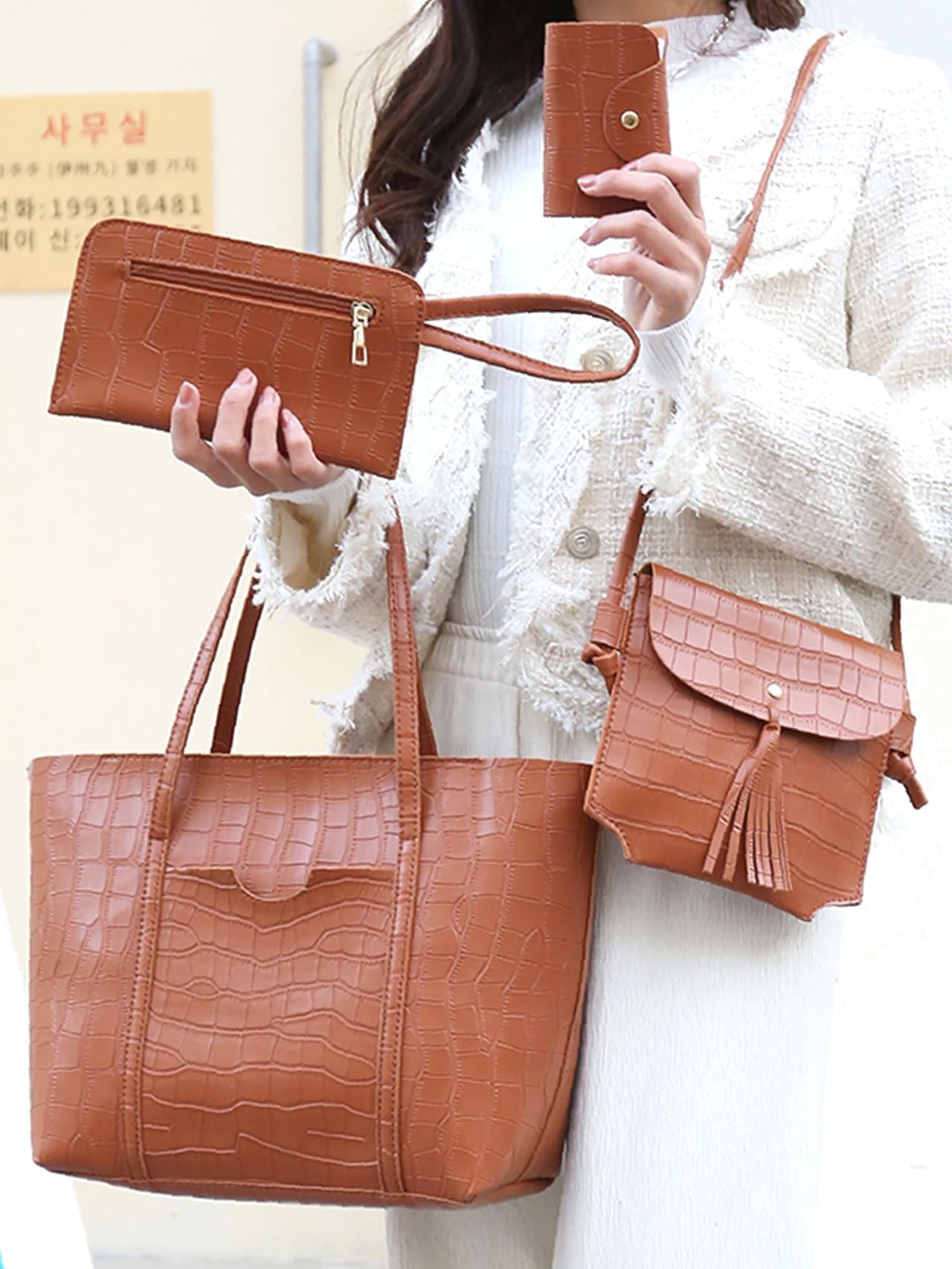Deze elegante 4-delige tassenensemble tilt je outfit moeiteloos naar een hoger niveau. Dankzij het subtiele krokodillenmotief en het hoogwaardige PU-leer combineert deze set stijl, gemak en veelzijdigheid – perfect voor zowel dagelijks gebruik als bijzondere gelegenheden.